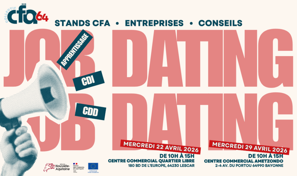 Les job dating du Collectif des CFA 64 Rencontrez des CFA, des entreprises et trouvez votre opportunité Le Collectif des CFA 64 organise deux job dating dédiés à l’apprentissage dans les Pyrénées-Atlantiques. L’objectif : faciliter les rencontres entre candidats, centres de formation et entreprises. Que vous soyez à la recherche d’une formation ou que vous […]
